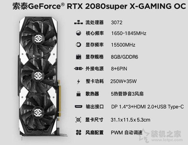 顯卡方面,RTX2080Super是一款全新發布的Super版本最強規格的顯卡,其性能介于在RTX2080和RTX2080Ti之間,性價比十足。索泰RTX2080 Super X-GAMING OC顯卡的核心采用Turing架構的TU104-450,內建3072個流處理器,同時搭配256-Bit位寬的8GB GDDR6顯存,顯存頻率達15500MHz,核心頻率達1650-1845MHz,配備5熱管靜音3風扇。擁有三個顯示接口,分別是3個DP 1.4接口、1個HDMI 2.0接口、1個USB Type-C接口。