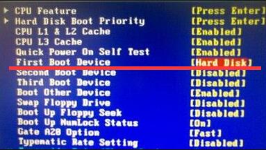 2、接著找到“First Boot Device”,選中后按Enter鍵會彈出一個窗口,選擇“Hard Disk”,按Enter鍵返回,如圖所示:
