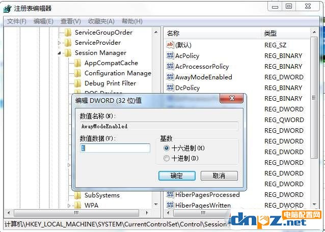 3、把AwayModeEnabled 數(shù)值設(shè)置為1確定,如果沒(méi)有該項(xiàng)目,新建一個(gè)Dword 32位值,命名為AwayModeEnabled再修改數(shù)值即可