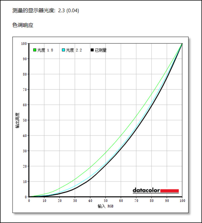 色調響應方面,已測量的黑色曲線應該盡量和淺藍色的“光度2.2”曲線保持一致,以及三條曲線的重合度越小越好,可以看到實測的黑色曲線和“光度2.2”曲線幾乎完全重合,色調響應同樣表現優秀。