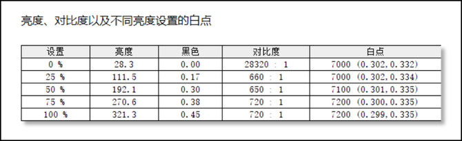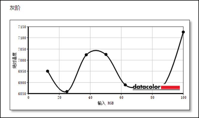 灰階曲線范圍在6850~7200之間呈波型浮動,通過下面的白點數據也可以看出,這款顯示器在色溫上的表現偏亮,用戶使用中也可以通過顯示器亮度、對比度等參數調整,來達到更加適合自己的色調。