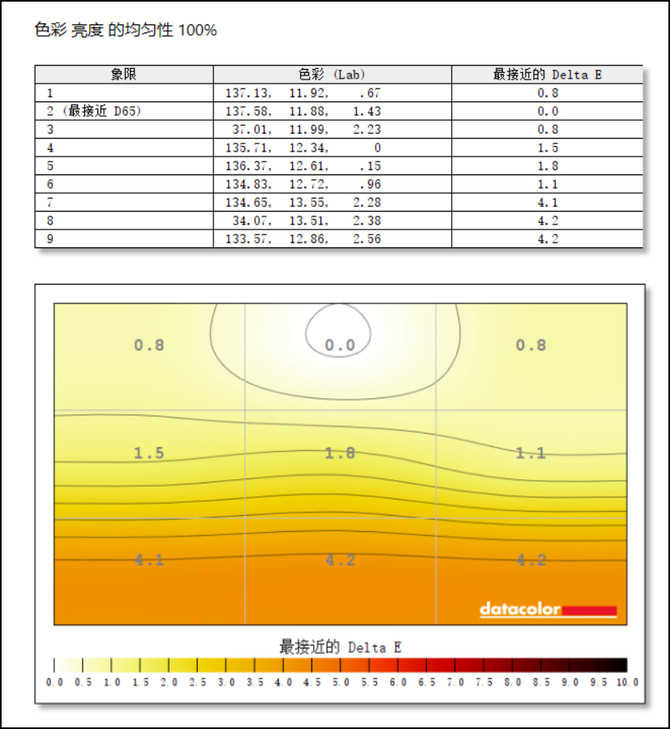 在色彩均勻性的測試中,可以看出顯示器的中上區域最接近D65的標準,上、下區域的色彩均勻呈現過渡性,與標準色溫最大差距數值4.2,該數值在3.2~6.5之間時,只有經過專業訓練的人士可以辨別其不同,大多普通人是觀察不到其中的差異的,達到專業級顯示器的標準。