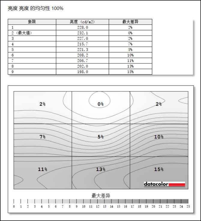 屏幕的亮度均勻性同樣跟色彩均勻性一致,呈現上下過渡,亮度均勻性最大差值為15%。
