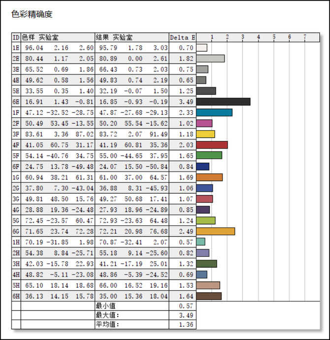 我們利用校色儀對24種顏色在標準光照環境下進行標準測試,如下圖所示,柱狀圖左側的△E值,反映的是顯示器與標準值之間差距的大小,其數值越小越好,分值越高則說明色彩越失真。最終的結果,最大值為3.49,最小值為0.57,平均值為1.36,一般情況下,△E值小于2的顯示器能夠達到專業級別。