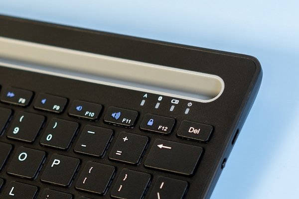 雷柏XK100藍(lán)牙鍵盤正面頂部是一個凹槽,凹槽的長度大約26cm,寬度大約1.3cm,可以長度25cm的平板電腦放置,可支持除了12.9英寸iPad Pro之外的所有iPad。將凹槽當(dāng)作支架使用的屏幕有110°左右的仰角。淺灰色的凹槽采用高強(qiáng)度的工程塑料,保證平板電腦使用時的穩(wěn)定性。凹槽右下角則是四顆并排的狀態(tài)指示燈,用于顯示大小寫、藍(lán)牙狀態(tài)、電量及電源狀態(tài)等。