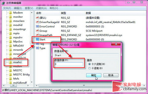 依次展開HKEY_LOCAL_MACHINESystemCurrentControlSetServicesMsahci項(xiàng)目,雙擊右邊窗口的“Start”名稱,看到“數(shù)據(jù)數(shù)值”默認(rèn)為“3”,將其改為“0”后,點(diǎn)擊“確定”按鈕退出(圖2)。