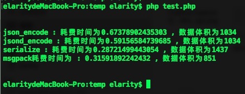 <?php// 故意搞了一個還算大的php數組,更容易看出差距來$arr=array(array('uid'=> 22193123,'gender'=>'famale','username'=>'elarity','password'=> md5('www123'),'relation'=>array(array('uid'=> 22193123,'gender'=>'famale','username'=>'elarity','password'=> md5('www123'),),array('uid'=> 22193123,'gender'=>'famale','username'=>'elarity','password'=> md5('www123'),),array('uid'=> 22193123,'gender'=>'famale','username'=>'elarity','password'=> md5('www123'),),array('uid'=> 22193123,'gender'=>'famale','username'=>'elarity','password'=> md5('www123'),),array('uid'=> 22193123,'gender'=>'famale','username'=>'elarity','password'=> md5('www123'),),array('uid'=> 22193123,'gender'=>'famale','username'=>'elarity','password'=> md5('www123'),),array('uid'=> 22193123,'gender'=>'famale','username'=>'elarity','password'=> md5('www123'),),array('uid'=> 22193123,'gender'=>'famale','username'=>'elarity','password'=> md5('www123'),),array('uid'=> 22193123,'gender'=>'famale','username'=>'elarity','password'=> md5('www123'),),),));// 每種序列化方案都執行100000次$counter= 100000;// json序列化方案,執行100000次echoPHP_EOL.PHP_EOL;$start= microtime( true );for($i= 1;$i<=$counter;$i++ ){$json= json_encode($arr);}$size=strlen($json);$end= microtime( true );$cost_time=$end-$start;echo"json_encode : 耗費時間為{$cost_time} , 數據體積為{$size}".PHP_EOL;// jsond序列化方案,執行100000次$start= microtime( true );for($i= 1;$i<=$counter;$i++ ){$jsond= jsond_encode($arr);}$size=strlen($jsond);$end= microtime( true );$cost_time=$end-$start;echo"jsond_encode : 耗費時間為{$cost_time} , 數據體積為{$size}".PHP_EOL;// serialize序列化方案,執行100000次$start= microtime( true );for($i= 1;$i<=$counter;$i++ ){$serialize= serialize($arr);}$size=strlen($serialize);$end= microtime( true );$cost_time=$end-$start;echo"serialize : 耗費時間為{$cost_time} , 數據體積為{$size}".PHP_EOL;// msgpack序列化方案,執行100000次$start= microtime( true );for($i= 1;$i<=$counter;$i++ ){$msgpack= msgpack_pack($arr);}$size=strlen($msgpack);$end= microtime( true );$cost_time=$end-$start;echo"msgpack耗費時間為 : {$cost_time} , 數據體積為{$size}".PHP_EOL;echoPHP_EOL.PHP_EOL;
