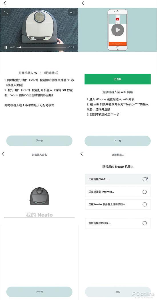 注冊登陸之后,APP會有視頻演示來提示你如何一步步操作讓D7連接上網絡。同時按住開始按鈕和右側緩沖器10秒,機器人將關閉并重置;再按開始按鈕啟動,等啟動完畢,WiFi圖標就會呈呼吸燈狀緩慢明滅。此時手機需要連接D7釋放的一個熱點,然后回到APP中設置機器的WIFI鏈接、命名等。