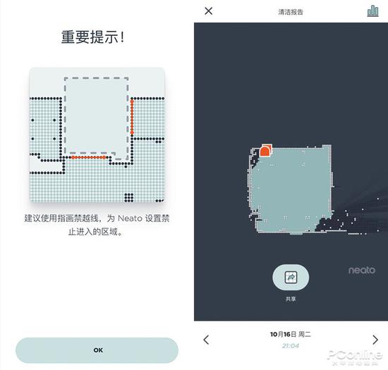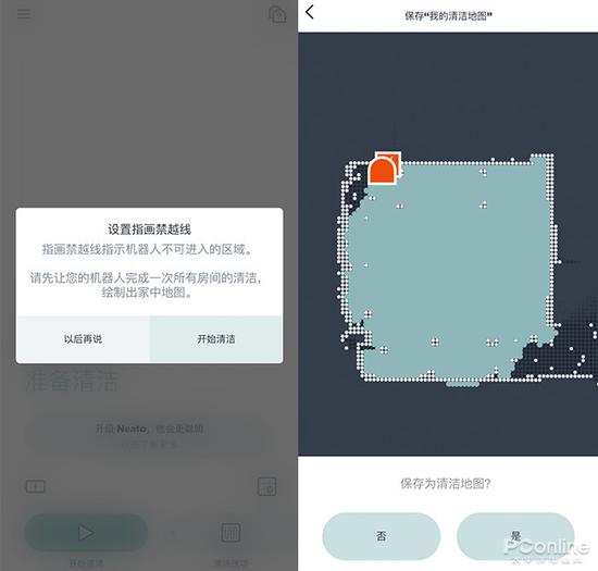 APP設計也如同Neato的產品一樣簡介優雅,首次使用掃地機的時候會提示讓掃地機先在整個屋子全面工作一次,需要打開房門,移除障礙物。清掃完畢之后APP會提示會提示是否保存為清潔地圖,“是”,然后生成一個家中的地圖到服務器。聽聞Neato服務器在美國,但是我測試感覺上傳和下載速度都非常不錯。話說這個底圖的準確度相當驚人,這個區域內的沙發、凳子腿、墻角這些細節都能在地圖中清晰分辨。