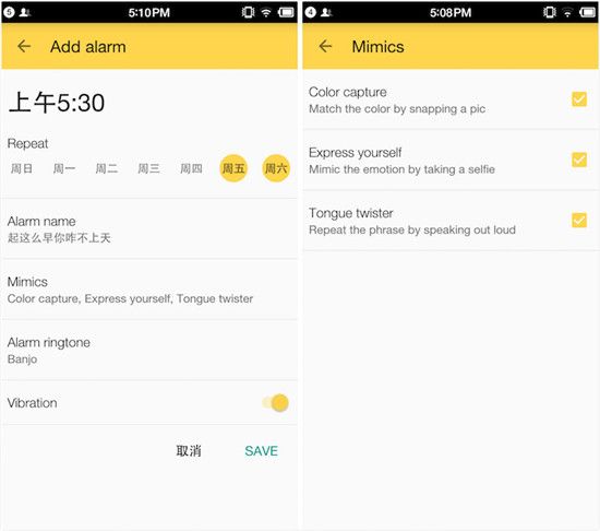 添加鬧鐘只需簡單幾步,選擇在一周當中的哪些日子里折騰你,給鬧鐘起個名字,選擇如何被折騰,選擇鈴聲等。Mimicker Alarm 只有三種折騰你的方式,但每種都足夠喪心病狂。Color capture 需要你拍下與提示相符的顏色;Express yourself 需要你做出與提示相符的表情并自拍;Tongue twister 則需要你念一段英文繞口令……