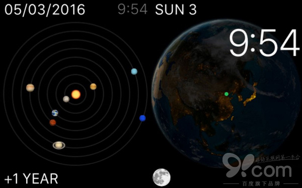 類似表盤還有太陽系表盤,轉動 Digital Crown 一圈就是一年,動畫展示一年中太陽系八大行星的運行軌跡;另一個地球表盤則顯示的是當下的地球,晚上十點的北京燈火通明,歐洲大陸還是日光下。