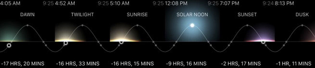 Apple Watch 的表盤,每一個都經過精挑細選。個人特別喜歡的是太陽運行軌跡表盤,蘋果將太陽在 24 小時內的運行軌跡做成表盤,根據用戶的地理坐標,顯示當下太陽在頭頂的位置,用戶還可以轉動 Digital Crown 來動畫演示一天的太陽軌跡。以筆者為例,位于北緯 39、東經 114度,在 2014 年 5 月 3 日,轉動 Digital Crown 就能看到幾個關鍵時刻:「拂曉 4:05」「黎明 5:10」「正午 12:08」「日落 7:07」和「黃昏 8:13」。看著這個表盤,我對時間流逝產生了一個無法從傳統手表上得到特殊理解,對「日出而作,日落而息」有了更感性的認識。