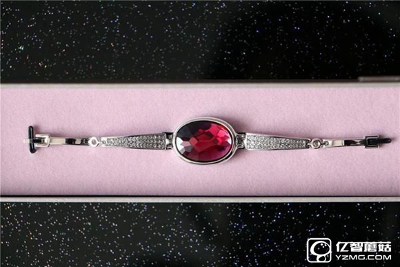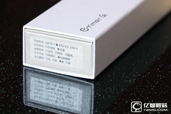 包裝盒的左端標(biāo)有產(chǎn)品信息,可以看到這款智能手鏈擁有2款金屬表鏈,3種顏色皮帶,主石分為貓眼石和水晶玻璃,顏色有紅、藍(lán)、紫、綠四種,可謂是選擇多多,本款手鏈型號(hào)ETG-2,表鏈為白金款,主石類型為紫色水晶玻璃。