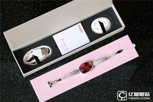 打開內(nèi)盒蓋,手鏈就卡放在粉紅色絨面板上,優(yōu)雅而恬靜,你可能會(huì)覺得這就是一條普通的手鏈,不過(guò)取出上層絨面板,看到下面放置的充電底座、數(shù)據(jù)線、說(shuō)明書,你會(huì)恍然發(fā)現(xiàn),這才是標(biāo)準(zhǔn)的智能手鏈配置。