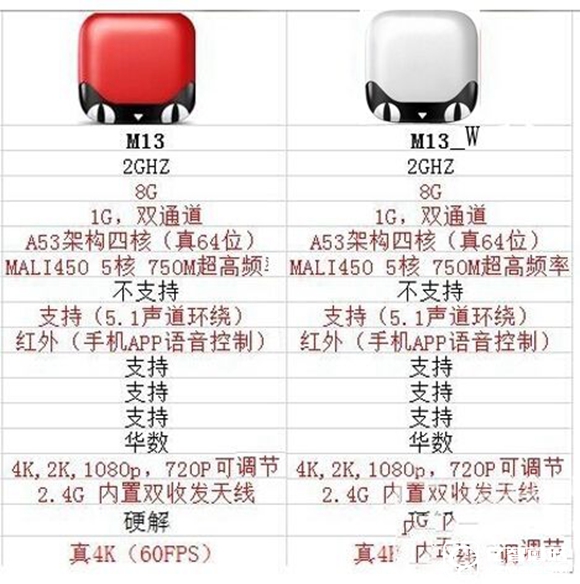 M13(紅色)和M13_W(白色)配置是一模一樣。只是顏色的不同,W僅僅是代表白色。所以大家根本不用糾結兩款盒子了,喜歡紅色就選M13,喜歡白色就選M13_W,不過小編還是比較喜歡紅色的M13,外觀上要比白色的高檔,而且天貓的主題色也是紅黑搭配,更耐看。