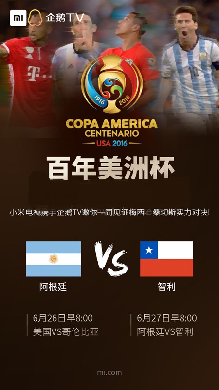 北京時間6月27日8:00,小米電視(含小米盒子)接入企鵝TV,超高清大屏轉播百年美洲杯決賽,梅西、阿奎羅、迪瑪利亞、桑切斯等國際足壇巨星登陸小米電視(含小米盒子)。此外,北京時間6月26日8:00,小米電視(含小米盒子)與企鵝TV 也將帶來美洲杯三四名決賽美國VS哥倫比亞的比賽爭奪,歡迎米粉與球迷屆時觀看。