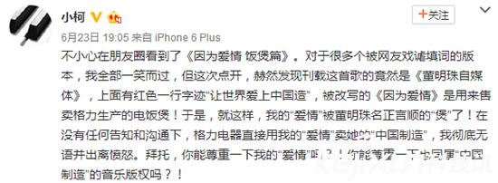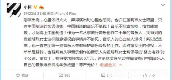 小柯在自己的微博中表示這是董明珠在用他的愛情在賣她的中國(guó)造,小柯表示不能接受這種事情,不能接受一個(gè)在宣傳中國(guó)造的人不尊重中國(guó)造的音樂版權(quán),所以小柯在后面聲稱,要求董明珠賠償500萬為中國(guó)的音樂版權(quán)保護(hù)事業(yè)做貢獻(xiàn)。