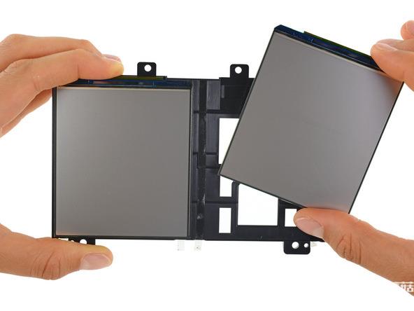 擰下4顆螺絲釘,拆下屏幕。屏幕和塑料顆之間用膠水粘連,不過用的膠水不多。
