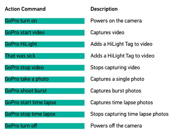 手冊中提到了10個聲控命令,每一個都相當簡單,除了“That was sick”。(與下方的“GoPro HiLight”命令相比,“That was sick”確實長了點)