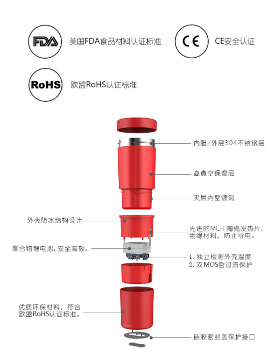 5.安全設計。Wottle 充電暖手杯采用了先進的MCH陶瓷發熱片,升溫迅速,溫度補償快,同時有良好的絕緣效果,防止導電。在電路設計上,Wottle 充電暖手杯可以獨立檢測外殼溫度,同時采用了雙MOS管過流保護,能有效防止超額電流對杯體的傷害。Wottle 充電暖手杯通過了歐盟CE強制安全認證標準。