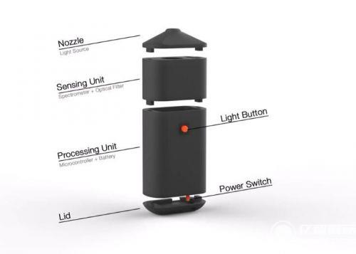 便攜式光譜儀的外殼由 3D 打印制成,內置有光譜儀芯片、紫外LED、光學過濾器、為無線數據通信安裝的藍牙模塊、用于模擬數字轉換的 Arduino 微控制器,以及一個可充電的鋰電池。