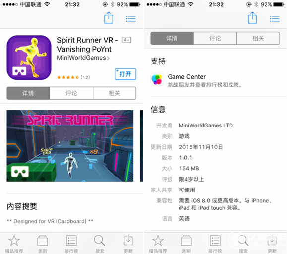 整體而言,Spirit Runner VR這款游戲在可玩性方面做的非常不錯,很好的將跑酷運動與VR結合在一起,盡管操作還有一些不太完善的地方,但相對于現狀做的不錯了,也有一定的創業型與娛樂性。不過在游戲界面設計和音樂上,其表現就比較一般了,有很多值得提升的地方。另外由于游戲畫面中會一直晃動,所以大家玩游戲十幾分鐘后,最好還是休息下,不然很容易會有暈眩嘔吐的感覺。