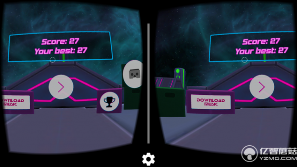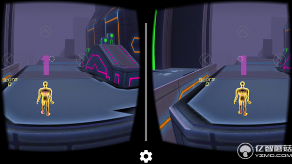 選擇VR模式之后,其屏幕立刻會分成兩個部分,與其他VR游戲以及視頻是相同的,這時將你的手機放在Cardboard 2中就可以直接進行游戲了。操作方法非常簡單,轉動你的腰部和腦袋,將屏幕的中心點放置在相關的選項上就可以了。