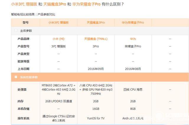 配置高低是評價一個產品好壞最直觀的參數。所以小編我從沙發網查看了這三個盒子的對比參數