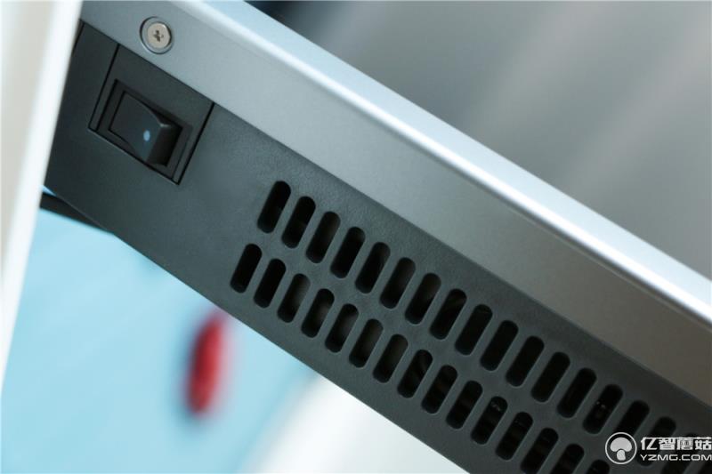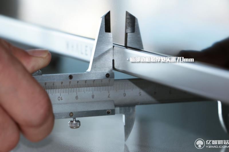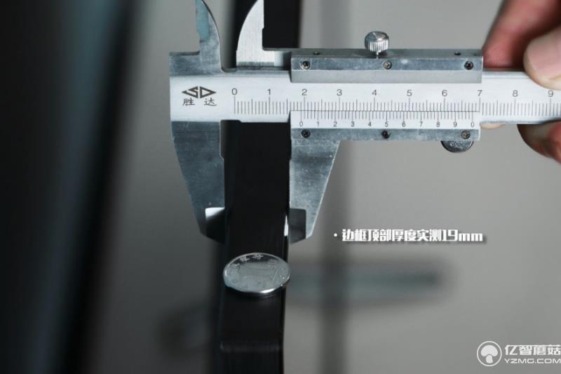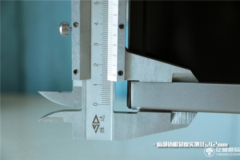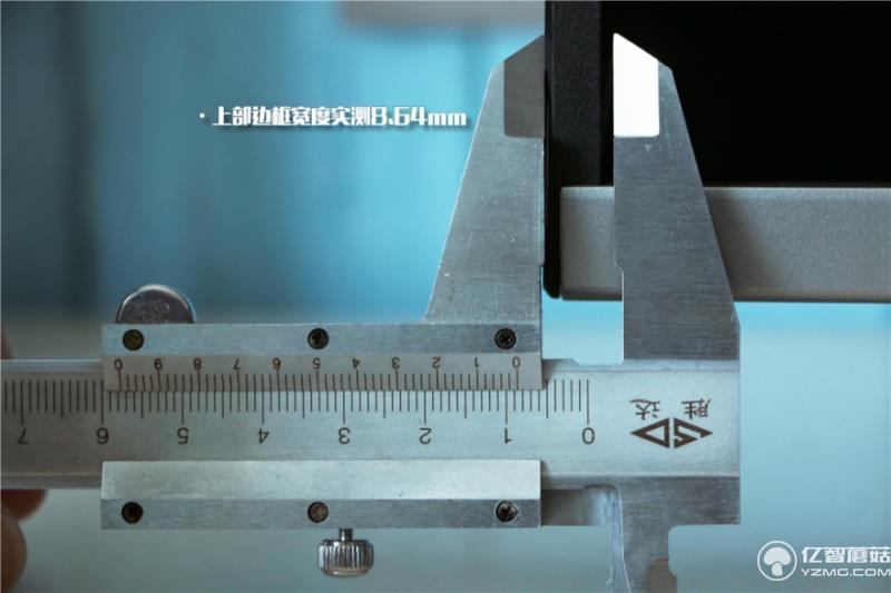 從實(shí)測(cè)來(lái)看,頂部邊框的厚度為19mm,因?yàn)椴捎昧说菇翘幚恚雌饋?lái)要更薄一點(diǎn),外框?qū)挾?.64mm,也屬于是比較窄的。