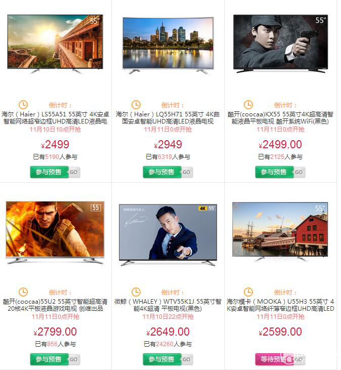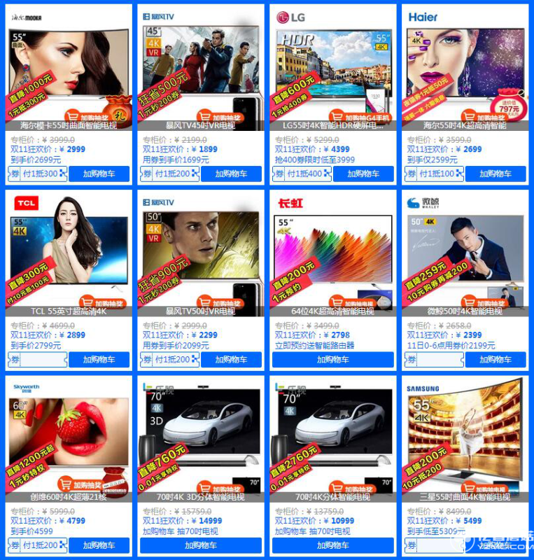 從搜索維度,參與雙11的55英寸電視有92個結(jié)果,4K超高清68款。價(jià)格10000元以上的1款,三星,12499;8000元以上2款,都是三星;7000元以上1款,索尼;6000元以上5款,三星兩款,海信、樂視、索尼各一款;5000元以上7款,三星2索尼2海信夏普樂視各1;4000元以上8款,三星2款、海信2款,夏普、創(chuàng)維、PPTV、東芝、各1款;3000元以上,創(chuàng)維7、海信5、TCL4、長虹3、樂視3、飛利浦2、三星2、PPTV、小米各1款;2000元以上14款,飛利浦3,長虹2、酷開2、創(chuàng)維、TCL、CNC、微鯨、暴風(fēng)、麥凱龍、龍?jiān)聘?款。
