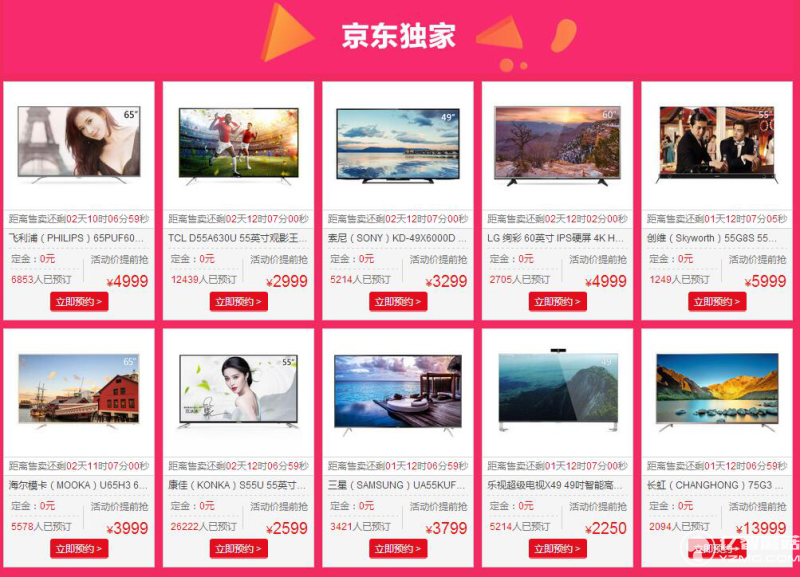 有10款電視,號稱京東獨(dú)家活動,其中最貴的是長虹75英寸,價(jià)格13999;最便宜的是樂視49英寸,價(jià)格2250;而索尼49英寸則3299元,貴了1000;其余55寸四款,最貴的創(chuàng)維5999,最便宜的康佳2599;另外,LG60英寸和飛利浦65英寸價(jià)格一樣,都是4999,海爾65英寸則只要3999。
