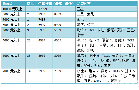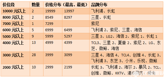 3、8000元、6000元也比較少,8000元檔僅三星、索尼、長虹有零星款;6000元檔略多一點(diǎn)。
