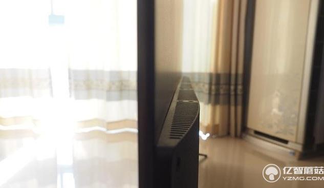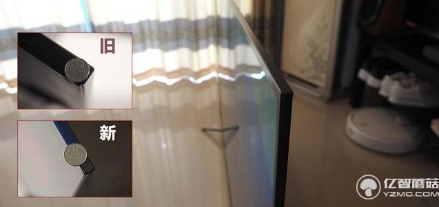 我這里有兩張新老55寸電視用同一枚1角硬幣做對比的畫面,可以看到微鯨55K2新機的屏幕厚度只有上代產品的2/3左右,約9.9mm。事實上,微鯨55K2采用的是目前比較流行的“上方超薄、元器件放在屏幕下部”的做法,因此給人的第一感覺就是“如同刀片一般”的超薄側面。只不過之前這類設計多出現在相對其他品牌相對高端的型號上,而微鯨則是把它下放的主力機型上了。
