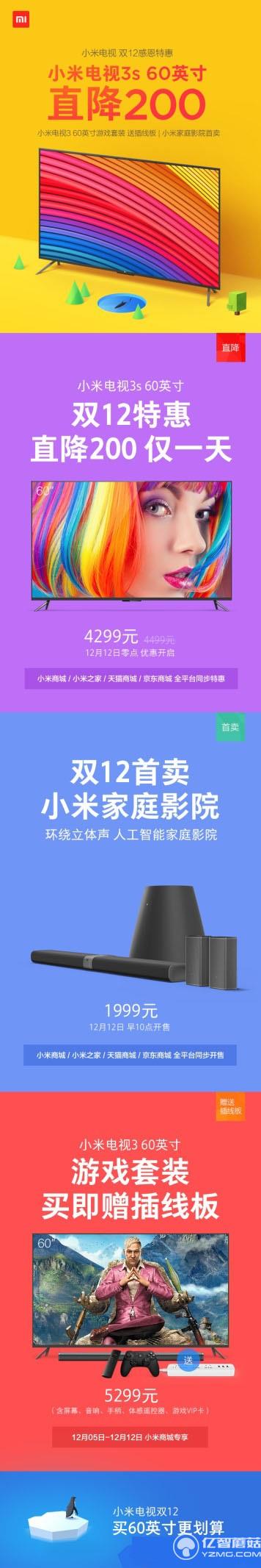 12月12日零點開始,原價4499元的小米電視3s 60英寸人工智能電視只需4299元,小米商城、小米之家、天貓商城、京東商城四大平臺同步感恩優惠。與此同時,從12月5日-12月12日,在小米商城購買小米電視3 60英寸游戲套裝(含藍牙手柄+體感遙控器+游戲VIP卡)即贈插線板。值得一提的是,11月發布的全新小米家庭影院4件套也將于雙12早10點在小米商城、小米之家、天貓商城、京東商城四大平臺進行首賣。