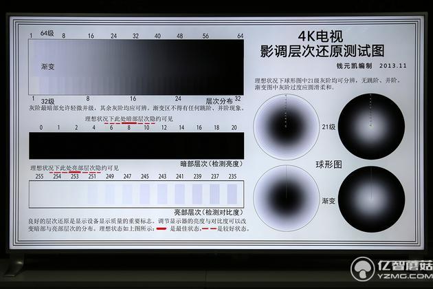 第二張圖是灰度測試,圖像中可能不是很清晰。正面觀看除了1和2之間無明顯區分外,其他層級表現都非常好。整體表現已經超過了大多數液晶電視。