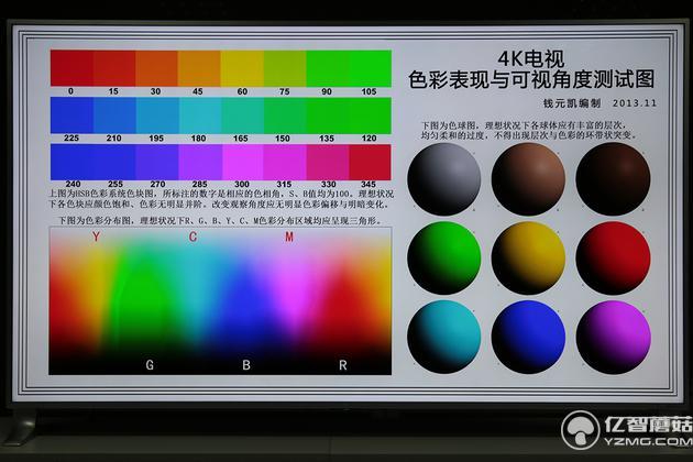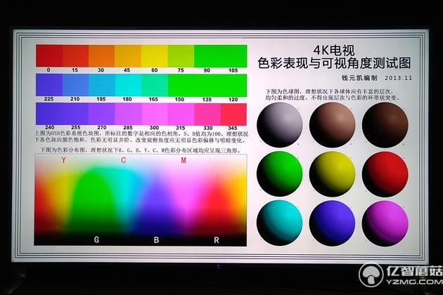 第四張圖色彩表現出了比較大的問題,雖然青色藍色紫色紅色黃色之間都呈現了完美的等腰三角形,但黃色與綠色之間出現了重大的色彩還原偏差,綠色甚至已經出現了明顯的斷層感。工程師表示這是工程機的原因。