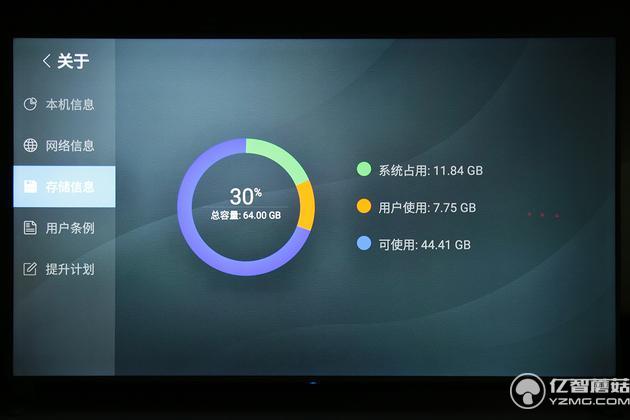 電視還采用了4GB內存和64GB高速閃存的配備,除去系統占用,用戶可用的空間大概為50多GB。同時依靠大內存,讓電視的操作也流暢了不少。