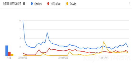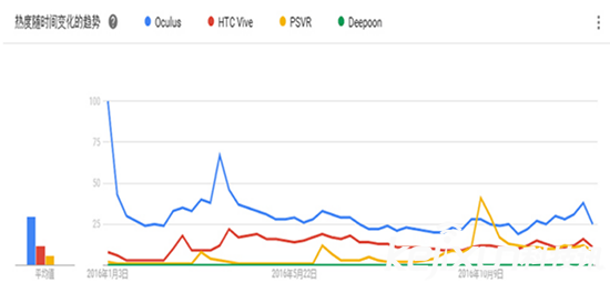 首先是被稱為三大頭顯的PSVR 、htc Vive及Oculus。在2016年里,三大頭顯陸續(xù)發(fā)貨,根據(jù)谷歌趨勢的搜索熱度,結(jié)果是Oculus>HTC Vive>PSVR。10月份,PSVR開始發(fā)貨,搜索熱度也隨之上升并超越Oculus及HTC Vive。隨后,PSVR的熱度下降并與HTC Vive不分上下。從這些數(shù)據(jù)中我們就可以看出,在國外消費(fèi)者的眼中,Oculus是好于PSVR和HTC Vive的。