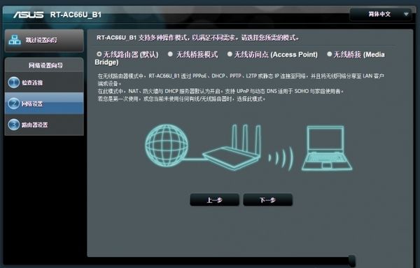 固件方面,第一次配置路由的話會有設置向導,其中一步可以看到路由器支持4種工作模式,路由模式和AP模式是大家比較熟悉的,無線橋接的話可以實現(xiàn)“萬能中繼”,這個功能是比較實用的。