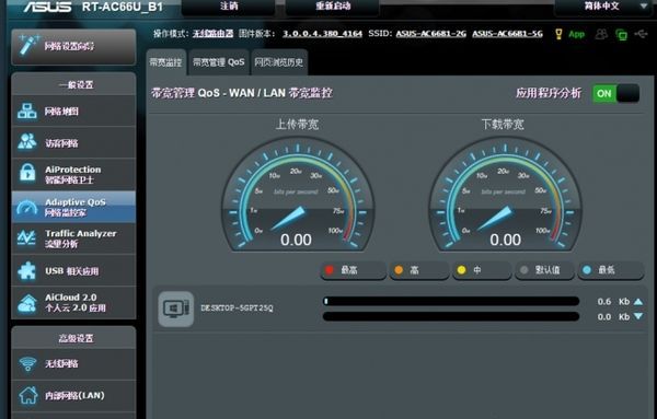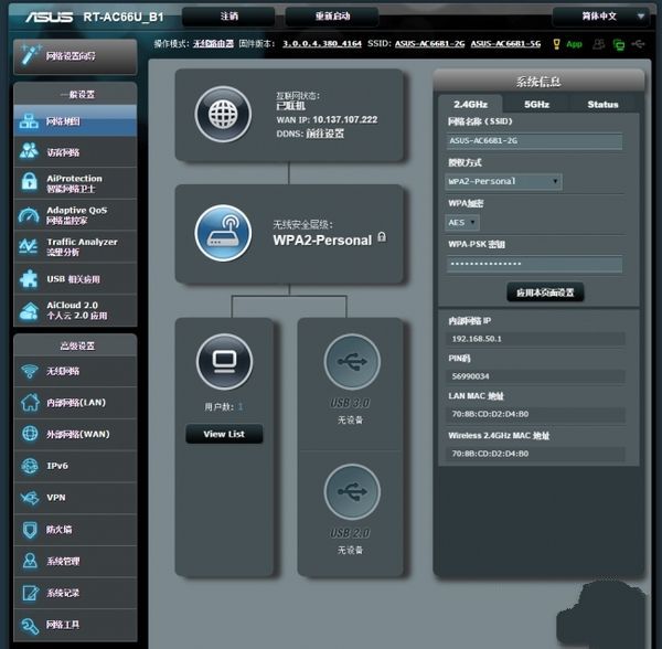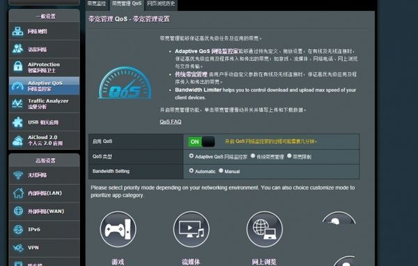 管理界面還是華碩傳統(tǒng)的深灰色界面,但是在左區(qū)功能菜單和其他華碩路由基本一致,不過少了華碩路由如RT-AC5300搭載的的Game Boost游戲加速功能。由于固件設置內容較多,我們挑幾個特別的設置和功能說說,常規(guī)設置就略過。