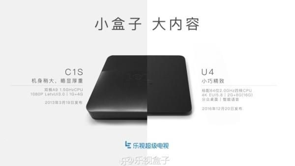 樂視官方表示,相較于C1S的厚重感,U4更加精致,而且是從配置到內容的全面升級,由雙核A9 1.5GHzCPU升級到標配64位2.0GHz四核CPU,1080P LetvUI3.0升級到4K EUI5.8,內存由1G+4G升級到2G+8G(16G),且增加分眾桌面和智能語音等功能。