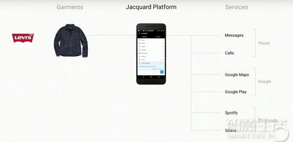 這件夾克使用的紡織品內含有特質的電子元,具有輕觸式遙控功能,專為自行車愛好者打造。這款外套能通過無線與智能手機連接,穿戴者只需通過觸控夾克袖口的 "Jacquard Tag"織物手勢傳感器 ,就能進行回復電話,進行Google Maps逐向導航等各種操作,用戶可以水洗這款智能牛仔夾克。