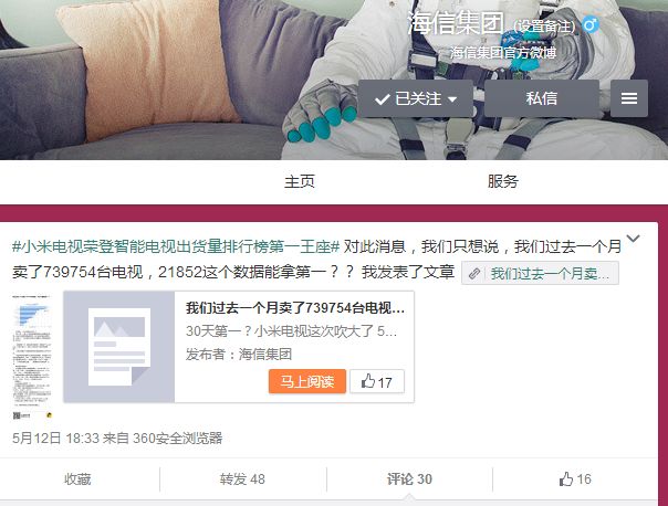 當(dāng)時(shí)這個(gè)所謂智能電視網(wǎng),在行業(yè)內(nèi)本身也不具備影響力,因此該微博發(fā)布后,另一家老牌彩電行業(yè)巨頭海信迅速在微博發(fā)布一篇名為《30天第一?小米電視這次吹大了》 文章,對(duì)小米電視所謂的出貨量第一進(jìn)行回懟。