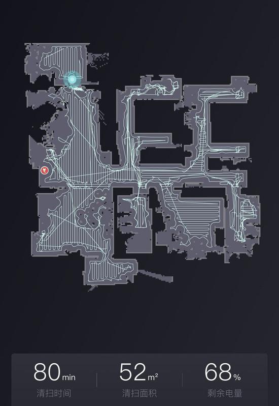 如果是全圖清掃,實(shí)際清掃區(qū)域?yàn)?52 平米,耗時(shí) 1 小時(shí) 20 分左右,走一圈后還是能剩下 68% 的電量。當(dāng)然,實(shí)際耗時(shí)也和掃地機(jī)器人遇到的障礙情況有關(guān),假如你家中擋路的東西比較多,自然也需要更長(zhǎng)時(shí)間的掃描和檢測(cè)。