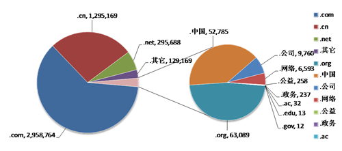 五、中國網站注冊使用的獨立域名繼續成“三國爭霸”態勢。在中國網站注冊使用的481.2萬余個獨立域名中,涉及的頂級域302個(具體見附件1),較去年(277個)增長25個,其中注冊使用“.cn”、“.com”、“.net”域名的中國網站數量最多,“.cn”、“.com”、“.net”獨立域名使用數量占整個獨立域名總量的94.6%。截至2014年12月底,“.com”域名使用數量最多,達到約295.9萬個;其次為“.cn”和“.net”域名,各使用129.5萬余個和約29.6萬個。中國網站注冊使用各類頂級域使用情況如圖1-2所示。