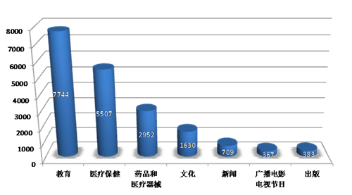 七、專業(yè)互聯(lián)網信息服務網站發(fā)展行業(yè)聚焦,文化類網站發(fā)展一年翻番。專業(yè)互聯(lián)網信息服務網站主要集中在教育、醫(yī)療保健、藥品和醫(yī)療器械等行業(yè)和領域,新聞、視聽節(jié)目、出版等行業(yè)和領域發(fā)展規(guī)模相對較小。截至2014年12月底中國網站中涉及提供專業(yè)互聯(lián)網信息服務的網站情況見圖1-4。