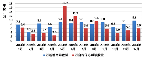 圖1-5:2014年網站主辦者新開通及自行停辦的中國網站數(shù)量月變化情況