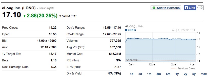 鳳凰科技訊 北京時間8月5日消息,據投資網站BidnessEtc報道,在接到騰訊的私有化要約后,藝龍股價周二大漲逾20%。