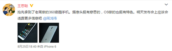 除了青春版之外,其實早在傍晚,國民老公王思聰也發出微博表示“搶先拿到了老周做的360奇酷手機。攝像頭挺有意思的,OS做的也挺有特色。明天發布會上應該會透露更多信息吧!”微博配圖中也放出了兩張奇酷手機的真機照,不過以王思聰所發出的真機圖來看,他拿到的并非青春版,很大可能是高配版的奇酷手機。銀白色配色(應該同樣會有土豪金配色可選),與青春版的最大區別在于,奇酷手機的背部將搭載雙攝像頭,背觸式指紋識別也從方形換成了圓形(看上去好像可以按壓的,說不定能支持指紋識別以外的操作)。