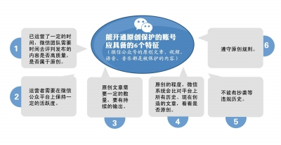目前為保護原創,微信公眾平臺已經開通了上線的原創聲明功能,抄襲舉報機制,另外符合條件的賬號將可以獲得集原創聲明、贊賞、評論、頁面模板的組合功能。